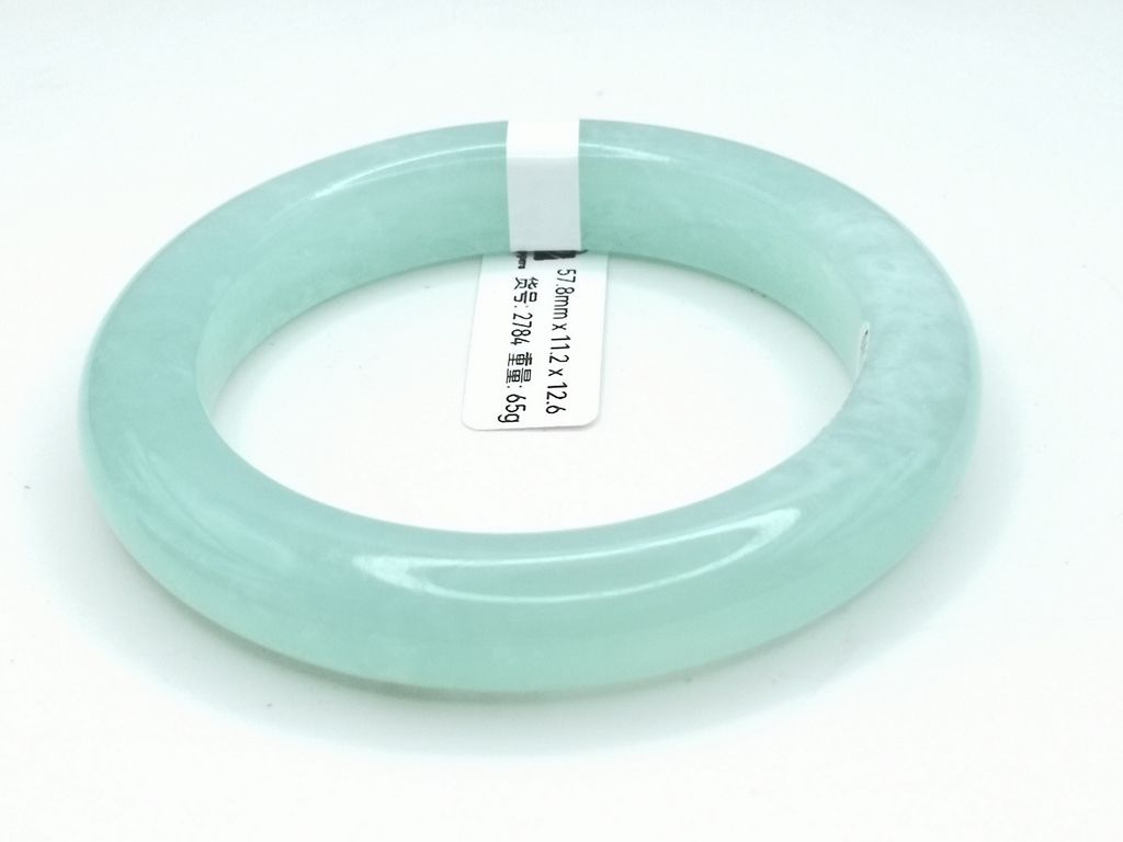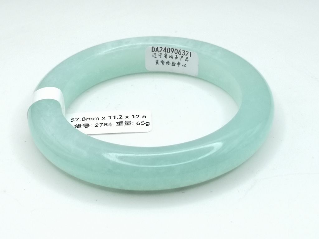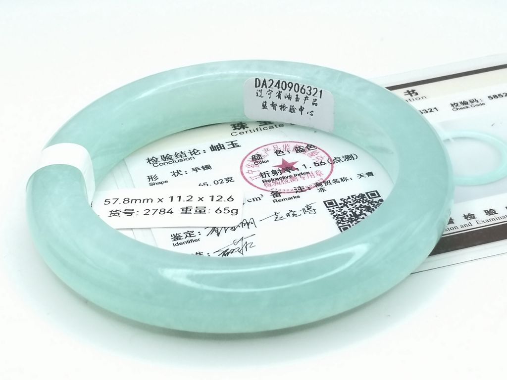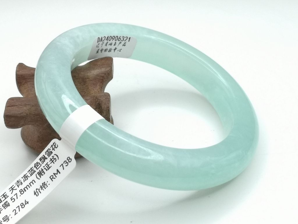 商品名称 (Product Name): B2784 - Natural Serpentine TianQing Frozen Jade Bangle 57.8mm (with certificate) 天然岫岩岫玉 天青冻 蓝色飘雪花玉手镯 57.8mm (附证书)